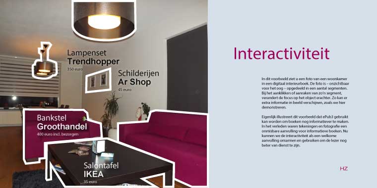 De foto in deze ePub is voorzien van verschillende lagen die hierboven tegelijk zichtbaar gemaakt zijn om de interactiviteit uit te leggen. Met een rollover, click of touch op een bepaald deel van de foto kan de bijbehorende laag, hier met bijschriften, aangezet worden. Door creatief gebruik van HTML5 is de foto nu interactief geworden.